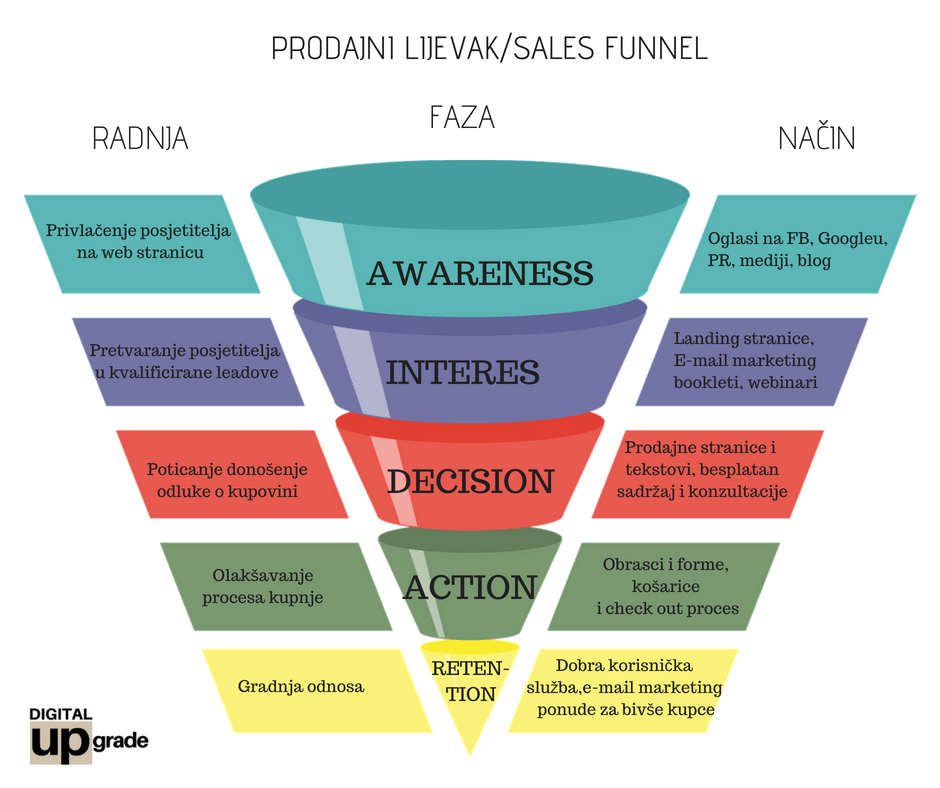 Poznati AIDA model, često korišten u marketing, prodaji i odnosima s javnošću objašnjava 4 stadija o ATTENTION, INTERES, DECISION i ACTION kao model mijenjanja potencijalnih kupaca u stvarne i ponavljajuće kupce. Ako ste se više bavili s proučavanjem sales funnela (ako još niste sigurno ćete naletjeti na njih) primijetili ste neke skraćenice (TOFU, MOFU, BOFU). One označavaju faze prema dijelovima lijevka tako je: osvješćivanje i pažnja vrh lijevka (Top of the funnel TOFU), interes je u sredini (Middle of the funnel MOFU), a odluka i akcija na dnu lijevka (Bottom of the funnel BOFU).